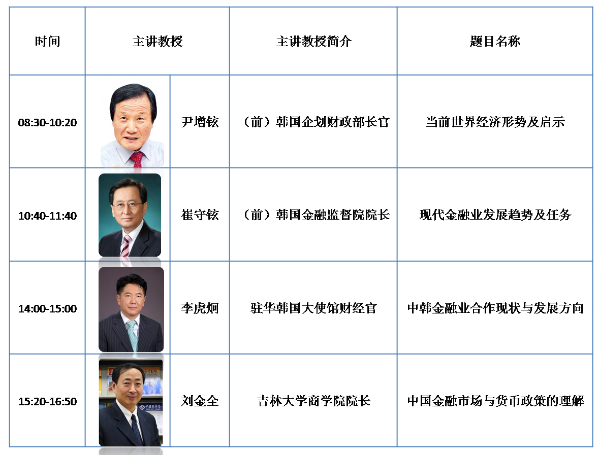 由中国·吉林大学与韩国·韩亚金融集团、中国·吉林银行共同主办的中国韩亚·吉林银行金融培训班2016年顺利进入第十一期,现将第十一期中国韩亚·吉林银行金融培训班开学典礼及首日授课安排公布如下,欢迎各位老师、同学们莅临授课现场!